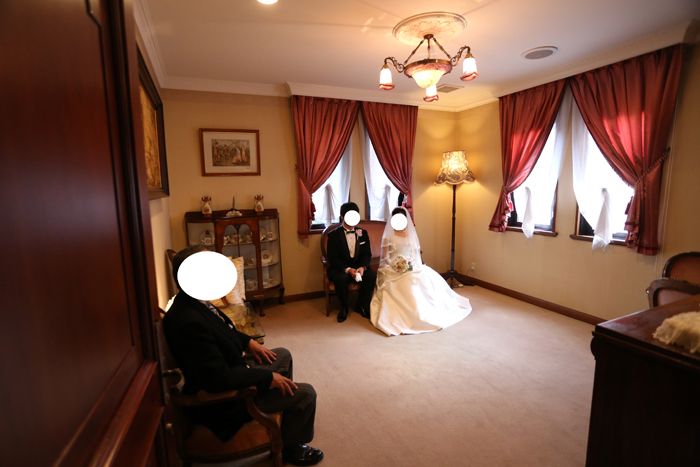 そして教会についたら、そのままおとなりの控室で牧師先生と挨拶を交わし、専属カメラマンがやってきて撮影開始!(挙式は専属カメラマン以外禁止。)
